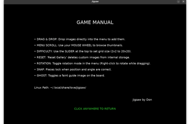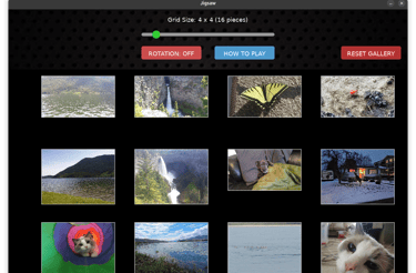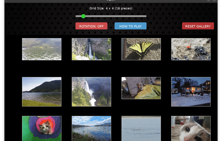 Put together pictures. You can do the included images or drag and drop your own images. Use the slider to decide the number of pieces in the puzzle. Turn on rotation to make it harder. Click on How To Play to learn more.